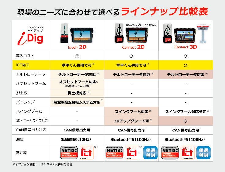 ICTは難しいと敬遠されがちですが、シンプルな2Dなら実は難しくなく、むしろ安全を確保し人手不足を解消できるのです。まずは現場が2Dに慣れて、重機からの乗降激減や、効率的に掘削できることを実感しながら、3Dへと徐々にステップアップしていくのがICT施工実現への近道です。iDigはすでに様々な現場で導入され、その効率化を実感いただいています。この機会にICT導入の一歩をご検討ください。