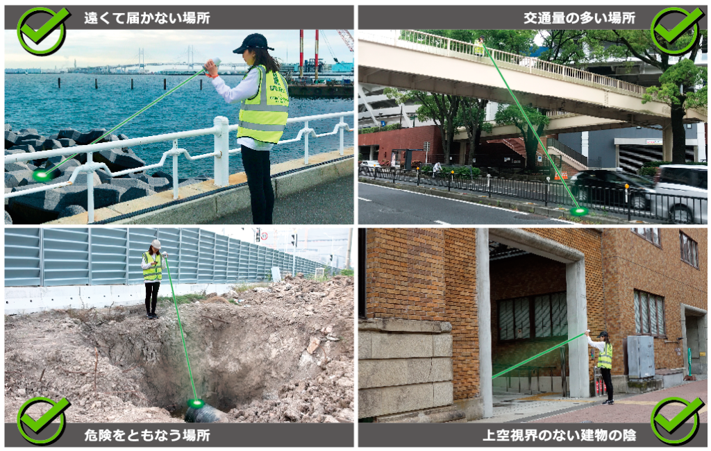 レーザーRTKを実現したGNSS受信機。レーザー照射したポイントの座標を瞬時に計算。高視認の長距離グリーンレーザーにより測定可能範囲は50mに広がりました。