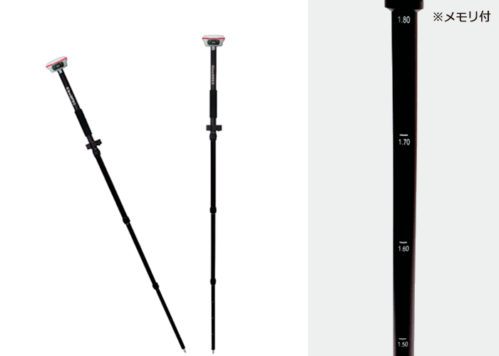 重さはわずか800g、測量時は180cmまで伸ばせ、収納時は65cmまで縮められる伸縮式の測量ポール。可搬性に優れ、作業負担を軽減します。気泡管はもちろん、コンパス付きで方位確認も容易。傾斜補正可能なGNSS受信機なら、これ1本でラクラク測量!