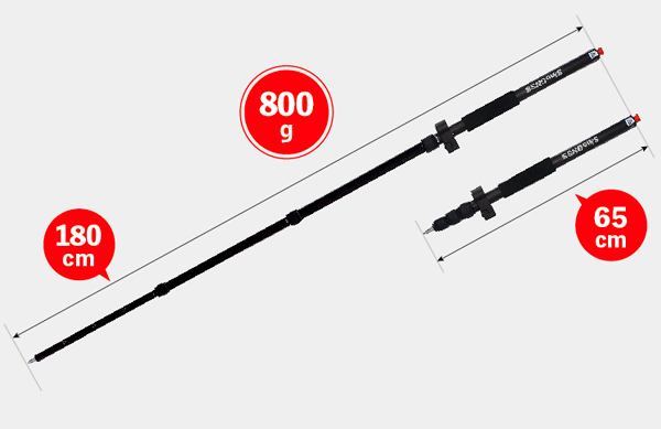 重さはわずか800g、測量時は180cmまで伸ばせ、収納時は65cmまで縮められる伸縮式の測量ポール。可搬性に優れ、作業負担を軽減します。気泡管はもちろん、コンパス付きで方位確認も容易。傾斜補正可能なGNSS受信機なら、これ1本でラクラク測量!